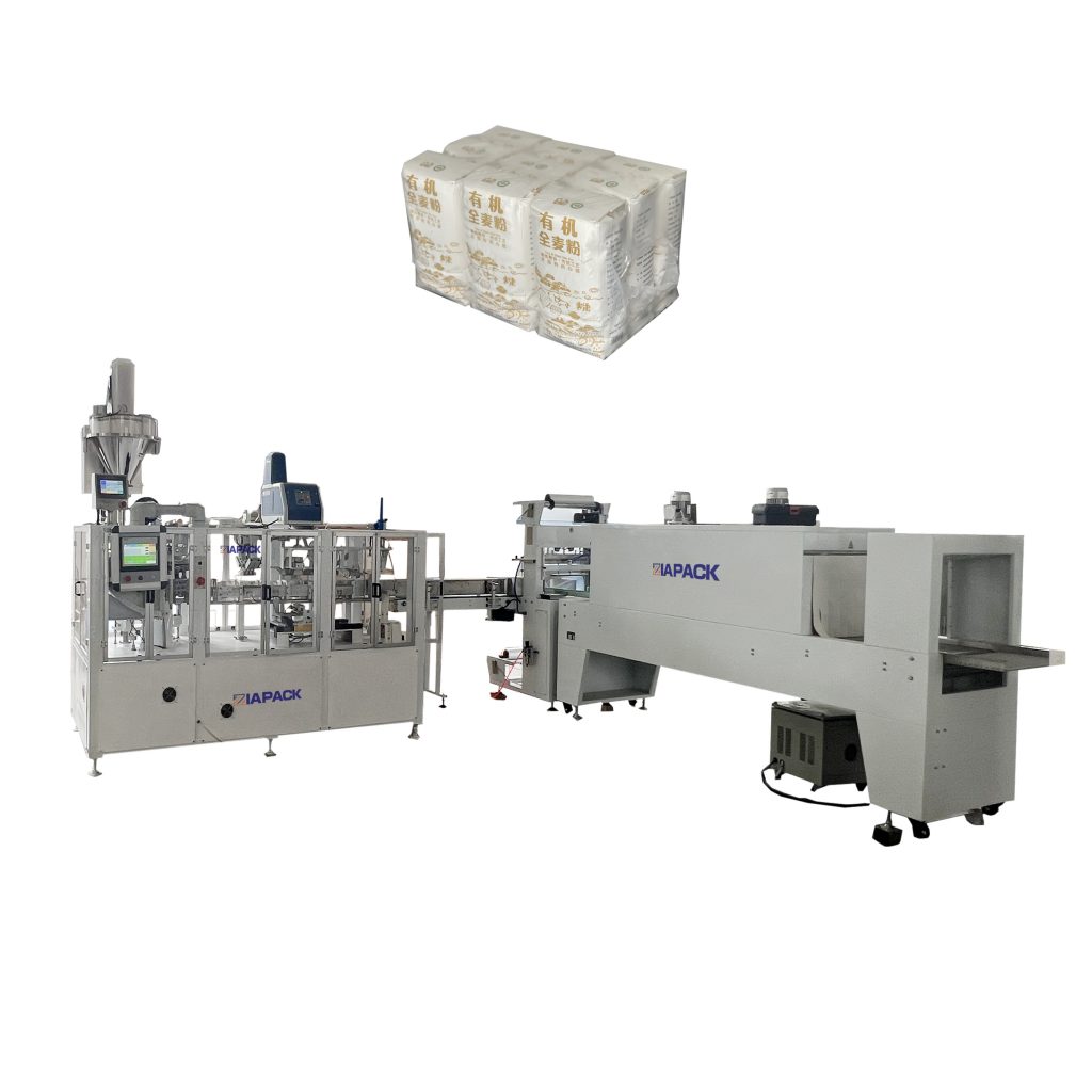 --- พับด้านบนกระเป๋า --- ติดกาว --- ส่งออกถุงเต็ม ---- เครื่องพิมพ์อิงค์เจ็ทรหัสวันที่ (ความคิดเห็น) --- เก็บถุงและจัดเรียง --- หดบรรจุภัณฑ์ (ความคิดเห็น) ---- การวางพาเลท (ความคิดเห็น)
