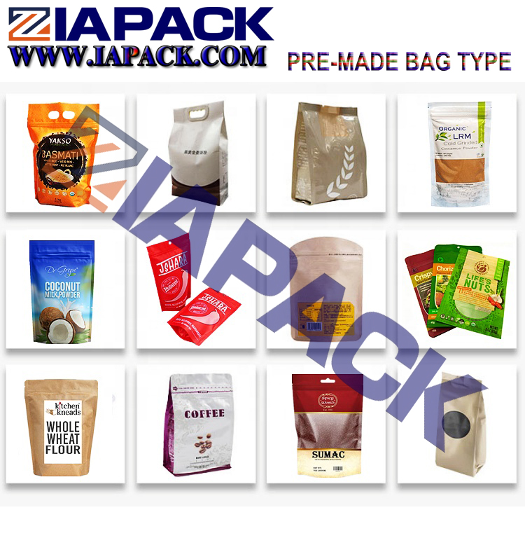 - Package material: stand up pouches, 3 side seal pouches, gusset bags, flat bottom pouches, Shaped pouches, etc.