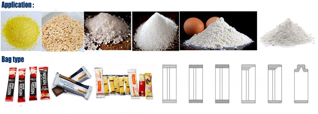เครื่องนี้ใช้เป็นหลักในการบรรจุผลิตภัณฑ์ผงเช่นนมผงผงนมชาผงกาแฟเครื่องเทศผงกะหรี่ผงโปรตีนเครื่องปรุงรสผงสมุนไพรผลิตภัณฑ์เคมีและผลิตภัณฑ์ทางการแพทย์